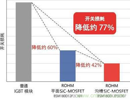 ROHM首先實現(xiàn)了采用量產(chǎn)中的溝槽結(jié)構(gòu)SiC-MOSFET元件的“全SiC”功率模塊的產(chǎn)品化。該產(chǎn)品的額定電壓為1200V,額定電流為180A,內(nèi)部電路為半橋配置。與同等額定水平的Si-IGBT功率模塊產(chǎn)品相比,其顯著優(yōu)勢當(dāng)然不必言說,即使與量產(chǎn)中的1200V/180A的SiC-MOSFET模塊相比,其開關(guān)損耗也大幅降低(圖7)。