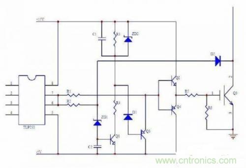 所以IGBT的短路保護一般是配合過載保護的,下面是一個TLP250增加慢降柵壓的驅(qū)動和短路保護的應(yīng)用電路圖: