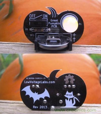 這是low voltage labs開發的南瓜PCB,除了形狀很可愛,還印了可愛的圖案;這款電路板上面有LED燈泡,就是讓你在萬圣節放進南瓜燈,不必擔心蠟燭會被風吹熄….其實直接當成擺飾也很有味道,而且只要6美元就買得到!