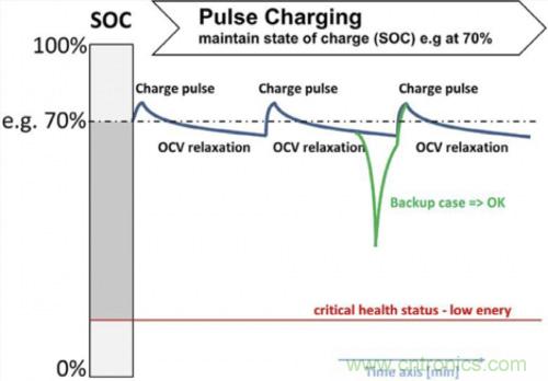 圖5.典型的維護充電 – 充電脈沖使荷電狀態處于定義的高水平。OVC 休息取決于荷載情況和自放電。對于典型的后備應用,荷電狀態必須高到足以滿足電能需求。