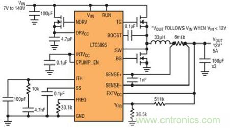 圖 1 所示原理圖在 7V 至 140V 輸入范圍內產生 12V 輸出。當輸入電壓低于 12V 時,輸出電壓將跟隨輸入電壓,因為該器件在頂端 MOSFET 連續接通時,會以 100% 占空比運行。由于 LTC3895 有內置充電泵,所以可以實現這種功能。