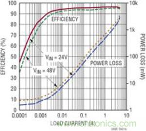 圖 2:LTC3895 在 24V或 48V 輸入、12V 輸出時的效率曲線