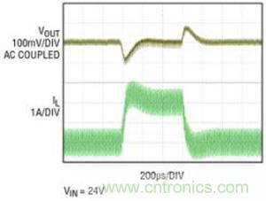 LTC3895 用一款帶寬為 25MHz 的快速運算放大器實現輸出電壓反饋。該放大器的大帶寬與高開關頻率和低電感值的電感器相結合,允許非常高的交叉頻率增益。這就允許針對非常快的負載瞬態響應優化補償網絡。圖 3 說明了在 12V 輸出時 2A 階躍負載的瞬態響應,與標稱值的偏離不到 100mV,恢復時間為 200µs。