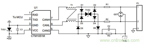 CAN總線物理層傳輸介質一般為銅制雙絞線,容易受到電磁場的干擾。CAN收發器屬于弱電元器件,對電壓電流的沖擊毫無抵抗力,因此復雜工業現場CAN總線的防雷設計十分必要。CAN總線防雷要從兩方面入手,一是CAN收發器處,即接口防護。二是物理介質處,即傳導防護。防護的思路主要是屏蔽干擾、提供泄放通道、隔離保護。