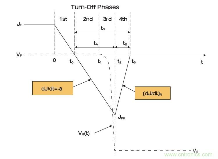當二極管正向偏壓變成反向偏壓時,電流不會立即降至零值,因為消除通態(tài)期間儲存的電荷需要時間。因此,當t=t0時,二極管開始換向操作,電流開始下降,下降斜率(-a)恒定,外部電感和電源電壓是決定斜率的唯一因素。在t1之前,二極管被施加正向偏壓,從t1到t2,二極管壓降上升,達到電源電壓;在t=t2時,反向電流達到最大值。間隔(t3-t0)被稱為反向恢復時間(trr),而負電流與零線之間的區(qū)域是反向恢復電荷(Qrr)。tB期間的電流斜率主要與產(chǎn)品設計和硅特性有關。