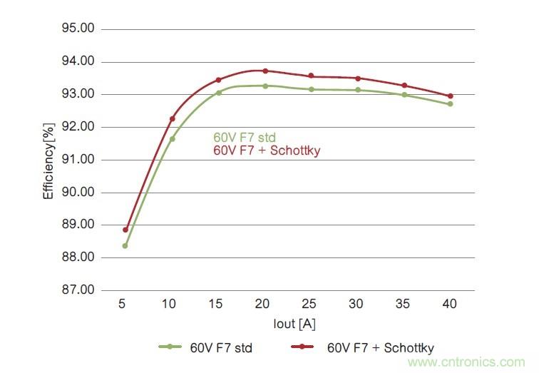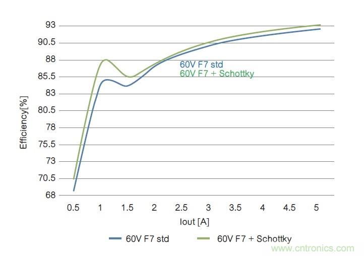 在兩個拓撲內,60V內置肖特基二極管的器件在整個電流范圍內性能表現(xiàn)更好,從而提高了系統(tǒng)總體性能。