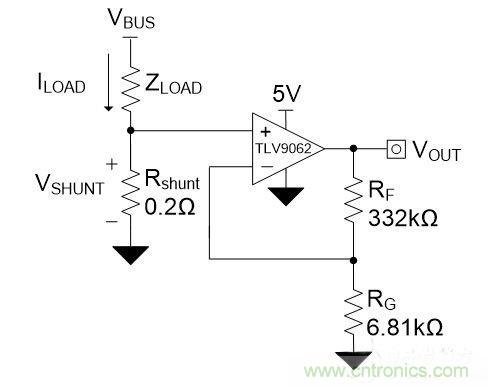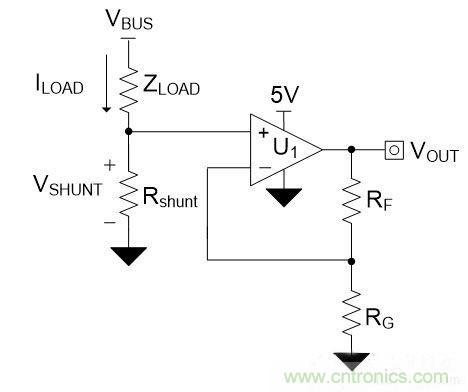 運(yùn)算放大器(op amp)。圖1是使用運(yùn)算放大器的典型低側(cè)電流感應(yīng)電路原理圖。