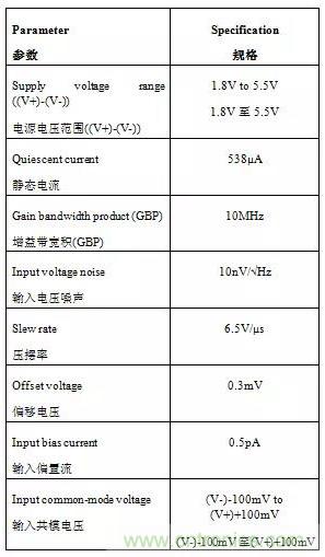 TLV906x系列高性能通用放大器可用于成本敏感型的低側(cè)電流感應(yīng)系統(tǒng),因?yàn)槠湓鲆鎺挘?0MHz)、壓擺率(6.5V/µs)、偏移電壓(0.3mV)以及輸入共模電壓范圍為負(fù)電源電壓以下100mV。下表中列出了一些TLV906x系列的技術(shù)參數(shù)。