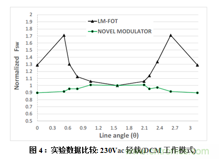 具體地講,圖3所示是開關(guān)頻率在寬輸入電壓(230Vac-左和115Vac-右)范圍和所有負(fù)載條件中(CCM-左, DCM - 右)保持恒定。與標(biāo)準(zhǔn)LM-FOT方法相比,本文提出的創(chuàng)新調(diào)制器的性能大幅改進(jìn),特別是在高壓線DCM運行模式更為明顯,如圖4所示。