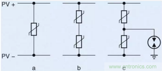 額定電壓為1000 V DC的金屬氧化物壓敏電阻通常用于太陽能逆變器的直流輸入。根據待處理線路電壓,例如電壓為300 VRMS的壓敏電阻可以是變頻器輸出的首選。在這兩種情況下,也可使用充氣式氣體放電管以實現額外防護。圖2為太陽能逆變器直流輸入的常用電路設計:最簡化版本(圖2a)僅使用一個額定電壓為1000 VRMS的壓敏電阻(例如片狀,直徑20毫米)。在這種情況下,額定直流電壓為1414 V DC,而鉗位電壓在100 A時為2970 V。圖2b所示電路通過串聯的兩個壓敏電阻運作,兩元件應專用于550 VRMS (745 V DC),以提供相同保護。這一設計提供了一大優點:鉗位電壓在電流為100 A時僅為2710 V,從而進一步抑制過電壓。此外,待吸收能量將平均分布于兩個組件,從而降低負荷系數。圖2c所示電路則在壓敏電阻與地面之間添加了一個氣體放電管。這一設計仍將提供充分保護,特別是當單個或兩個壓敏電阻出現故障或因負荷導致老化時。必須使用氣體放電管,以免當兩個壓敏電阻同時故障時進入持續導電狀態。