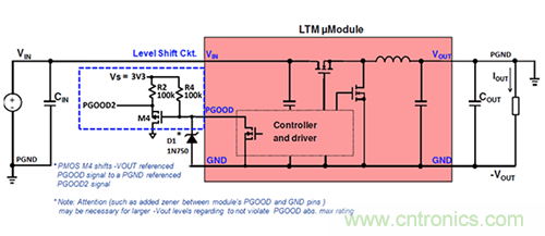 圖5中的簡單電路將μModule穩壓器的GND引腳作為PGOOD信號,并將其電平轉換為PGND參考信號PGOOD2,該信號適用于系統的進一步使用。在電路中,當模塊輸出一個PGOOD高電平信號時,PMOS M4關閉,R2將PGOOD2拉高以提供電壓Vs. 齊納二極管D1保護PGOOD引腳不超過其絕對值。最大。評分。當模塊輸出PGOOD低電平信號時,M4打開并將PGOOD2拉低至系統地。請注意,如果V S + | -V OUT | 可以省略齊納二極管D1