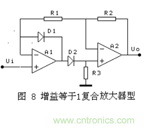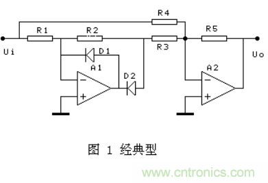 其它幾種,有的在D2導(dǎo)通的半周內(nèi),通過(guò)A2的復(fù)合實(shí)現(xiàn)A1的負(fù)反饋,對(duì)有些運(yùn)放會(huì)出現(xiàn)自激. 有的兩個(gè)半波的輸入阻抗不相等,對(duì)信號(hào)源要求較高。