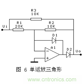 圖7正半周,D2通,增益=1+(R2+R3)/R1;負(fù)半周增益=-R3/R2;要求正負(fù)半周增益的絕對(duì)值相等,例如增益取2,可以選R1=30K,R2=10K,R3=20K