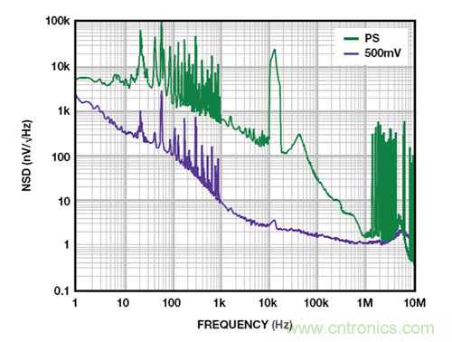 如 ADM7150 超低噪聲、高 PSRR 調(diào)節(jié)器一類的新型 LDO 實(shí)際上級(jí)聯(lián)了兩個(gè) LDO,因此,結(jié)果得到的 PSRR 約為各個(gè)級(jí)之和。這些 LDO 要求略高的裕量電壓,但能夠在 1 MHz 條件下實(shí)現(xiàn)超過 60 dB 的 PSRR,較低頻率下,PSRR 可以遠(yuǎn)超 100 dB。圖 7 所示為一個(gè) 5 V 的 ADM7150 的噪聲頻譜密度,其負(fù)載電流為 500 mA,裕量為 800 mV。10 Hz 至 100 kHz 范圍內(nèi),輸出噪聲為 2.2 μV rms。隨著裕量降至 600 mV,整流諧波開始顯現(xiàn),但當(dāng)輸出噪聲升至 2.3 μV rms 時(shí),其對(duì)噪聲的影響很小。
