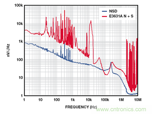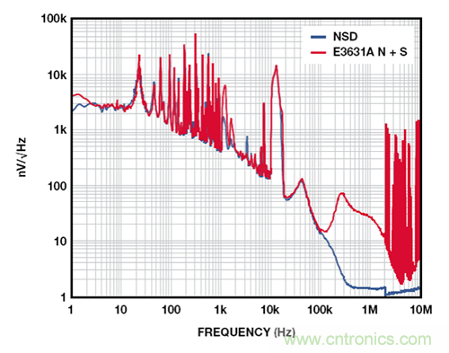 圖 4 展示的是 2.5 V ADM7160 在 500 mV 裕量和 100 mA 負(fù)載條件下,相對(duì)于 E3631A 臺(tái)式電源的輸出噪聲,該臺(tái)式電源在 20 Hz至 20 MHz 范圍內(nèi)的額定噪聲低于 350 μV-rms。1 kHz 以下的許多雜散為與 60 Hz 線路頻率整流相關(guān)的諧波。10 kHz 以上的寬雜散來自產(chǎn)生最終輸出電壓的 DC-DC 轉(zhuǎn)換器。1 MHz 以上的雜散源于環(huán)境中與電源噪聲不相關(guān)的 RF 源。在 10 Hz 至 100 kHz范圍內(nèi),這些測(cè)試所用電源的實(shí)測(cè)噪聲為 56 μV rms,含雜散為104 μV。LDO 抑制電源上的所有噪聲,輸出噪聲約為 9 μV-rms。