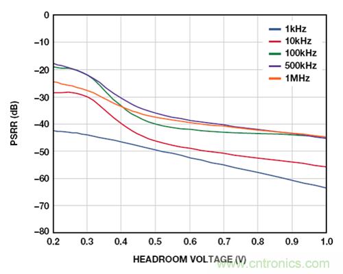 隨著裕量電壓的減小,PSRR 也會(huì)減小,壓差可能變得非常大。例如,在 100 kHz 下,裕量電壓從 1 V 變?yōu)?500 mV,結(jié)果將使PSRR 減少 5 dB。然而,裕量電壓的較小變化,從 500 mV 變?yōu)?00 mV,結(jié)果會(huì)導(dǎo)致 PSRR 下降 18 dB 以上。