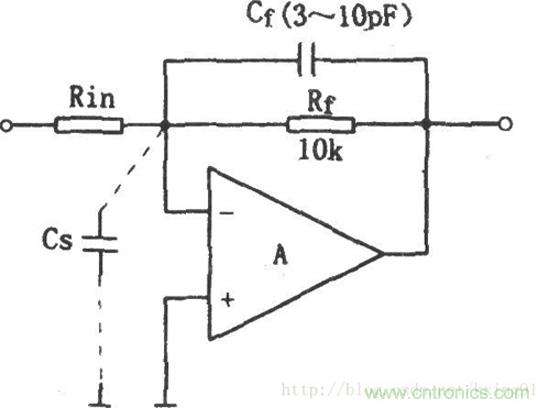 一般線性工作的放大器(即引入負(fù)反饋的放大電路)的輸入寄生電容Cs會(huì)影響電路的穩(wěn)定性,其補(bǔ)償措施見圖。放大器的輸入端一般存在約幾皮法的寄生電容Cs,這個(gè)電容包括運(yùn)放的輸入電容和布線分布電容,它與反饋電阻Rf組成一個(gè)滯后網(wǎng)絡(luò),引起輸出電壓相位滯后,當(dāng)輸入信號(hào)的頻率很高時(shí),Cs的旁路作用使放大器的高頻響應(yīng)變差,其頻帶的上限頻率約為: