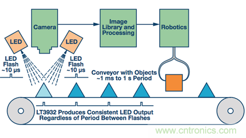 機器視覺系統可以使用并聯LED驅動器來創建自動圖像處理所需的快速、方形、高電流波形。通過并聯轉換器,LT3932 LED驅動器的專有相機閃光燈技術可以擴展到更高的電流。采用并聯LT3932轉換器,即使關斷時間較長,也可以實現3 A和更高的微秒級脈沖。無論LED閃光之間的關斷時間有多長,LED相機閃光波形都能保持方形且無抖動。