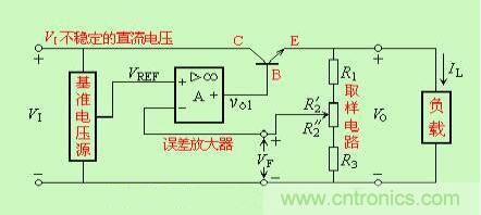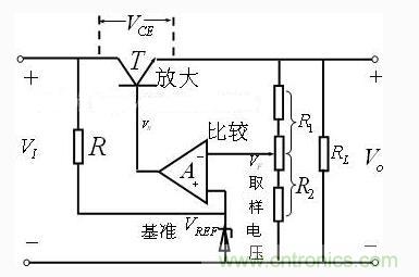 VI是整流濾波后的電壓,T為調(diào)整管,A為比較放大電路,VREF為基準(zhǔn)電壓,它由穩(wěn)壓管Dz與限流電阻R構(gòu)成。R1與R2組成反饋網(wǎng)絡(luò),是用來反映輸出電壓變化的取樣環(huán)節(jié)。
