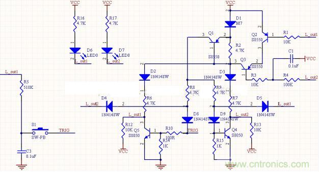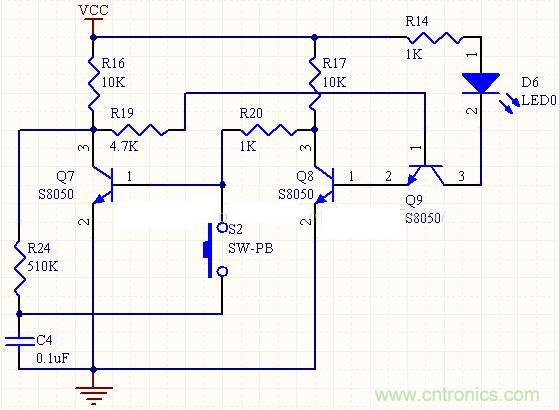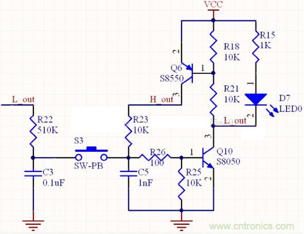 利用Q10的輸出與輸入狀態相反(非門)特性和電容的電流積累特性。剛上電時Q6和Q10的發射結均被10K電阻短路所以Q6和Q10均截止,此時實測電路耗電流僅為0.1uA,L_out輸出高,H_out輸出低。此時C3通過R22緩慢充電最終等于VCC電壓,當按下S3后C3通過R26給Q10基極放電,Q10迅速飽和,Q6也因此飽和,H_out變為高電平,當C3放電到Q10be結壓降0.7V左右時C3不再放電,此時若按鍵彈開C3將進一步放電到Q10的飽和壓降0.3V左右,當再次按下S3,Q10即截止。