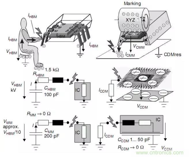 1、人體放電模式(HBM):當然就是人體摩擦產生了電荷突然碰到芯片釋放的電荷導致芯片燒毀擊穿,秋天和別人觸碰經常觸電就是這個原因。業(yè)界對HBM的ESD標準也有跡可循(MIL-STD-883C method 3015.7,等效人體電容為100pF,等效人體電阻為1.5Kohm),或者國際電子工業(yè)標準(EIA/JESD22-A114-A)也有規(guī)定,看你要follow哪一份了。如果是MIL-STD-883C method 3015.7,它規(guī)定小于<2kV的則為Class-1,在2kV~4kV的為class-2,4kV~16kV的為class-3。