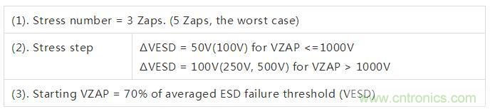 ESD的測試方法類似FAB里面的GOI測試,指定pin之后先給他一個ESD電壓,持續(xù)一段時間后,然后再回來測試電性看看是否損壞,沒問題再去加一個step的ESD電壓再持續(xù)一段時間,再測電性,如此反復直至擊穿,此時的擊穿電壓為ESD擊穿的臨界電壓(ESD failure threshold Voltage)。通常我們都是給電路打三次電壓(3 zaps),為了降低測試周期,通常起始電壓用標準電壓的70% ESD threshold,每個step可以根據(jù)需要自己調整50V或者100V。