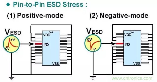 1. I/O pins:就是分別對input-pin和output-pin做ESD測試,而且電荷有正負之分,所以有四種組合:input+正電荷、input+負電荷、output+正電荷、output+負電荷。測試input時候,則output和其他pin全部浮接(floating),反之亦然。