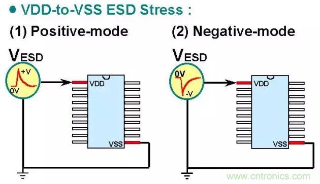 3、Vdd-Vss之間靜電放電:只需要把Vdd和Vss接起來,所有的I/O全部浮接(floating),這樣給靜電讓他穿過Vdd與Vss之間。