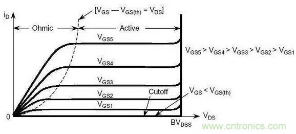 該參數(shù)反映了器件可以處理的脈沖電流的高低,脈沖電流要遠高于連續(xù)的直流電流。定義IDM的目的在于:線的歐姆區(qū)。對于一定的柵-源電壓,MOSFET導(dǎo)通后,存在最大的漏極電流。如圖所示,對于給定的一個柵-源電壓,如果工作點位于線性區(qū)域內(nèi),漏極電流的增大會提高漏-源電壓,由此增大導(dǎo)通損耗。長時間工作在大功率之下,將導(dǎo)致器件失效。因此,在典型柵極驅(qū)動電壓下,需要將額定IDM設(shè)定在區(qū)域之下。區(qū)域的分界點在Vgs和曲線相交點。