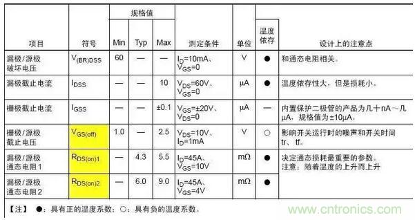 VGS(th)是指加的柵源電壓能使漏極開始有電流,或關(guān)斷MOSFET時電流消失時的電壓,測試的條件(漏極電流,漏源電壓,結(jié)溫)也是有規(guī)格的。正常情況下,所有的MOS柵極器件的閾值電壓都會有所不同。因此,VGS(th)的變化范圍是規(guī)定好的。VGS(th)是負溫度系數(shù),當溫度上升時,MOSFET將會在比較低的柵源電壓下開啟。