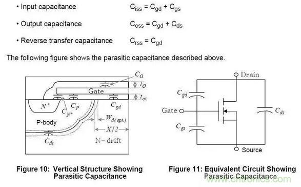 在源極接地的情況下,測得的漏極和柵極之間的電容為反向傳輸電容。反向傳輸電容等同于柵漏電容。Cres =Cgd,反向傳輸電容也常叫做米勒電容,對于開關(guān)的上升和下降時間來說是其中一個重要的參數(shù),他還影響這關(guān)斷延時時間。電容隨著漏源電壓的增加而減小,尤其是輸出電容和反向傳輸電容。