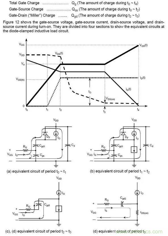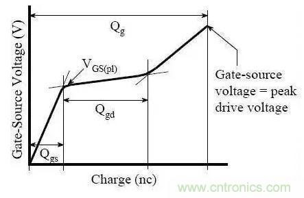 Qgs從0電荷開始到第一個拐點處,Qgd是從第一個拐點到第二個拐點之間部分(也叫做“米勒”電荷),Qg是從0點到VGS等于一個特定的驅(qū)動電壓的部分。