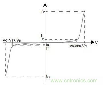 在智能儀表行業里一般采用RS-485通訊。下圖所示為RS-485通訊接口的典型應用。在保護RS-485接口不被靜電或者浪涌損壞通常用SMBJ5.0CA來做接口保護如下圖3所示,當靜電或者浪涌電壓高于5V時,SMBJ5.0CA會開始動作,將電壓鉗位在很低的位置,如果電流超過了峰值電流IPP話,最終電壓會被鉗位在9V左右,從而保護了后一級的器件不被損壞。