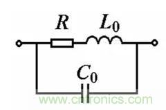 同一個電阻元件在通以直流和交流電時測得的電阻值是不相同的。在高頻交流下,須考慮電阻元件的引線電感L0和分布電容C0的影響,其等效電路如圖1所示,圖中R為理想電阻。由圖可知此元件在頻率f下的等效阻抗為