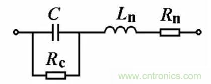 在交流下電容元件總有一定介質(zhì)損耗,此外其引線也有一定電阻Rn和分布電感Ln,因此電容元件等效電路如圖 3所示。圖中C是元件的固有電容,Rc是介質(zhì)損耗的等效電阻。等效阻抗為