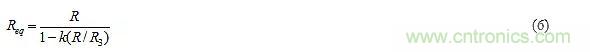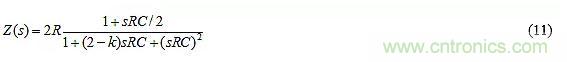其中R2代表電位器在其左端和游標之間的部分。對于給定的元件值,從左端到右端改變游標將使k在0<k<2的范圍內變化。現在,R3上的電壓為(1+k)vn–vn,即kvn,在右邊是正的,表明R3將為C提供電流kvn/R3。鑒于R從C中汲取電流vn/R,因此從C流出的凈電流為iC=vn[1/R+1/(-R3/k)],表明C視R與一個負電阻–R3/k并聯,凈等效電阻Req=R||(–R3/k)]。擴展后可以得到: