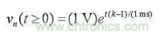 在圖5a的電路中,由vn表示的節點和地之間的阻抗為Z(s)=R||(1/sC)=R/(1+sRC),因此在s=-1/(RC)=-1/(1ms)時電路具有一個極點。假設vn(0)=1V,我們可以得到: