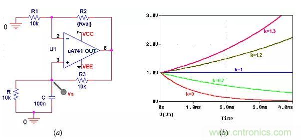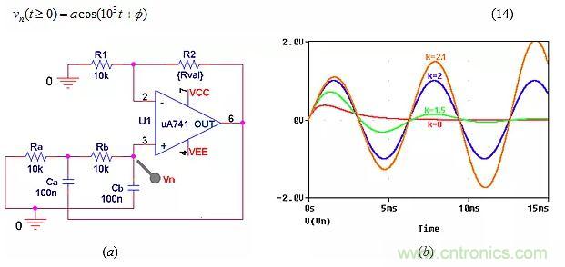 將k提高到2以上,使運算放大器注入的能量超過端口電阻可以消耗的能量,引起發散振蕩,如圖9b中k=2.1所示。振蕩將持續增長到運算放大器飽和為止。