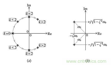 圖10:(a)作為k的函數的根軌跡(b)在阻尼響應狀態下的極點對。