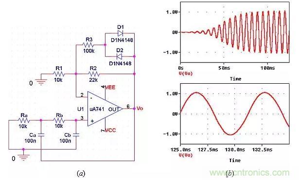 在圖11a中,電源接通時,兩個二極管仍然關閉,因此k=R2/R1=22/10=2.2,表明振蕩增加。隨著振蕩的增加,二極管在交替的半周期內逐漸導通,所以k=[R2||(R3+rd)]/R1,其中rd是動態二極管電阻(rd隨二極管電流而減小)。在rd<<R3的極限情況下,我們將得到k=(22||100)/10=1.8,表示電路可在1.8<k<2.2的范圍內調整k的值,這包括k=2.0時持續振蕩達到所需幅度的情況。