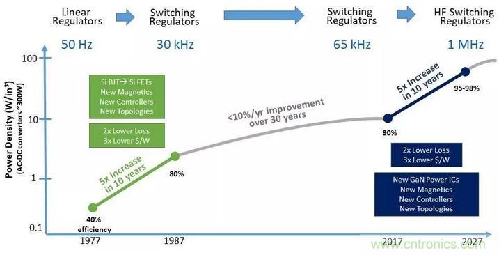 功率密度(AC-DC轉(zhuǎn)換器~300W);線性調(diào)節(jié)器;開關(guān)調(diào)節(jié)器;高頻開關(guān)調(diào)節(jié)器;新磁性元件;新控制器;新拓?fù)浣Y(jié)構(gòu);2倍低損耗;3倍低成本/W;10年5倍提升;超過30年每年<10%改善;十年5倍提升;新GaN功率IC;效率。