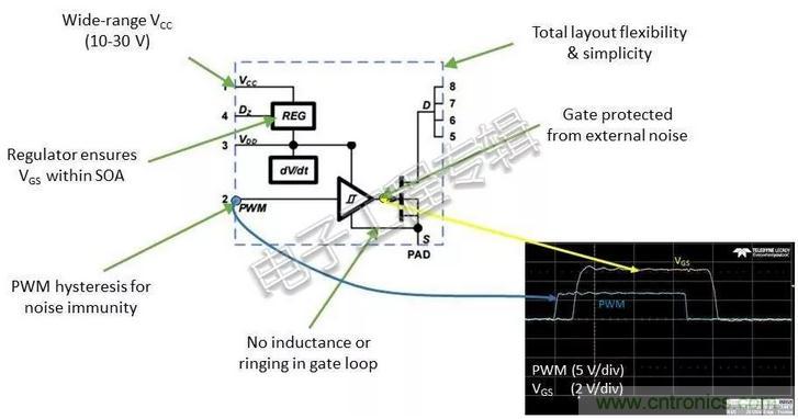 寬范圍Vcc;調(diào)節(jié)器可保護SOA內(nèi)的VGS;滯后的PWM可抗噪聲干擾;整體布局靈活簡潔;柵極可防止外部噪聲。