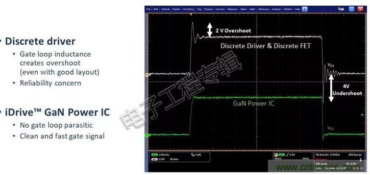 沒有柵極阻抗或電阻的分立解決方案會產(chǎn)生不穩(wěn)定的電路。 如果添加了阻抗,它會變得穩(wěn)定,但也會導(dǎo)致很長的開關(guān)周期。 因此,如果可以直接連接驅(qū)動器輸出和柵極輸入,那么就可以快速運行并保持穩(wěn)定。壓擺率只需要一個電阻即可搞定。 因此,集成意味著一種非常可控的高性能器件。