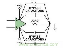 電源端接地:這種方法在大多數(shù)情況下都是最有效的,采用多個并聯(lián)電容器將運(yùn)算放大器的電源引腳直接接地。一般說來兩個并聯(lián)電容就足夠了——但是增加并聯(lián)電容器可能給某些電路帶來益處。
