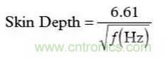 在高頻段,必須考慮一種稱為“趨膚效應(yīng)”的現(xiàn)象。趨膚效應(yīng)會引起電流流向?qū)Ь€的外表面——結(jié)果會使得導(dǎo)線的橫截面變窄,因此使直流(DC)電阻增大。雖然趨膚效應(yīng)超出了本文討論的范圍,這里還是給出銅線中趨膚深度(Skin Depth)的一個很好的近似公式(以cm為單位):