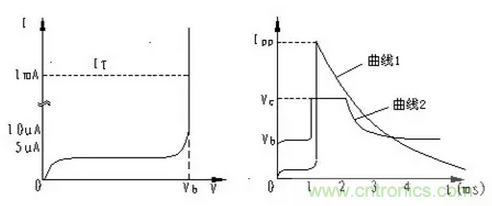 如果用圖示儀觀察TVS的特性,就可得到圖1中左圖所示的波形。如果單就這個曲線來看,TVS管和普通穩壓管的擊穿特性沒有什么區別,為典型的PN結雪崩器件。