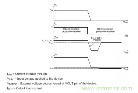 在通過ON引腳禁用器件并且VOUT被強制為外部電壓后,只有非常少量的電流將從VOUT流向VIN。 這將防止在外部電壓的電源上產生任何額外的電流負載。