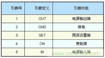 我們仍以AAT4610為例,說明電子開關實現過流保護的工作原理。AAT4610采用SOT-23塑料封裝(如圖1),5個引腳的定義見表1。