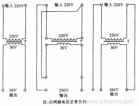 圖中的黑圓點表示繞組的同名端。如果將初、次級的連接線改為同名端相連;則輸出電壓將降低6.3V。采用這種接法;負載電流不得大于初、次級的額定電流。網(wǎng)路電壓如經常比220V低(或高)30~40V;可選220V/36V的變壓器連接。