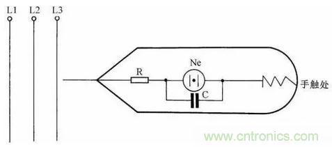 為了快速、準確地判斷,可在一般的低壓驗電筆的氖泡上并聯(lián)一只1500pF小電容,這樣在測強電時,電筆照常發(fā)光。而測得的是感應電時,感應電會通過電容再經過人體被大地吸收掉,所以電筆不發(fā)光。在自制這種驗電筆時應把電筆上串聯(lián)的保護電阻放在測電筆線路的最前端以保障安全,見圖36。